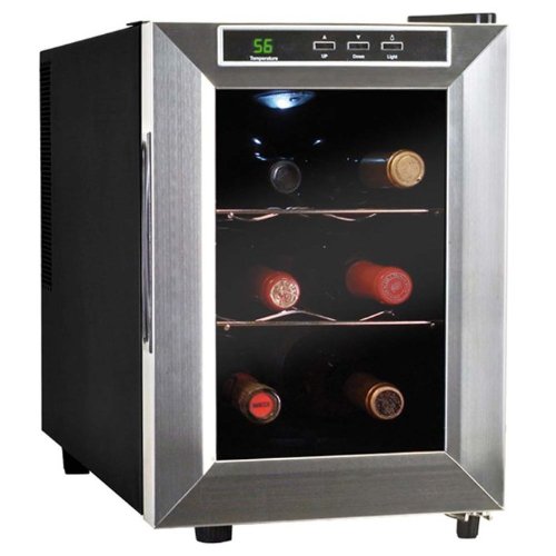 Vinotemp VT-6TEDS Thermo Electric Digital Black w/Stainless Steel trim (6) Bottle wine chiller. This is our most compact table top wine cooler which stores 6 bottles of your favorite wine at just the right temperature. With the innovative thermo-electric cooling system, which involves very few moving parts, your wine will be protected from unneccessary vibration. More importantly, Thermo-electric cooling does not use ozone depleating chemicals such as CFC's or HCFC's so you will be sure that you are doing your part to preserve the environment. For increased enery efficiency, the VT-6 uses dual paned glass windows, a technology that has been proven in the construction industry. They have better insulation properties and better UV protection providing energy efficiency which will lead to less electricity usage and savings. Featuring a black cabinet with stainless steel door trim and handle and sturdy wire shelf racking for individual bottle storage.